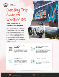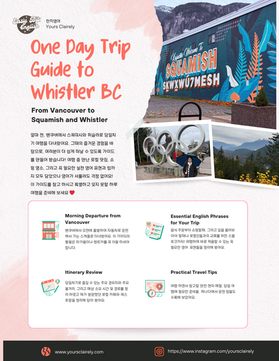 이 가이드는 영어 초보자도 편안하고 즐겁게 캐나다 휘슬러를 둘러 볼 수 있도록 실전 영어 표현과 로컬 팁들을 가득 담았습니다. 밴쿠버에서 출발해서 Squamish, Shannon Fall, 그리고 Whistler까지의 주요 명소와 현지인 추천 맛집, 꼭 들러볼 만한 상점들, 그리고 여행 내내 사용할 필수 영어 표현 43가지까지! 여행하면서 겪을 수 있는 다양한 상황에 맞춰 누구나 쉽게 사용할 수 있도록 정리 했어요.